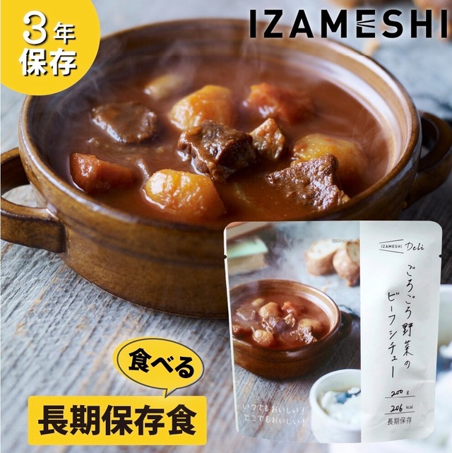 【IZAMESHIとは?】 食べずに捨てる備蓄食から、食べる長期保存食へ。 いつでも、どこでも、おいしく食べられる。 ご飯やおかずはもちろん、パンやスイーツまでフルコースの食事が揃う長期保存食IZAMESHI(イザメシ)。 デリシリーズは化学調味料不使用にこだわりました。 素材本来の味を活かし、出汁や調味料で味を調えているため、普段のおかずにもおすすめです。 ※保存年数は製造日より起算しています。 ■赤ワインとトマトが効いた大人のビーフシチューです。 「IZAMESHI Deli」はこだわりの具材がうれしい、ひと手間プラスのプレミアムシリーズです。 素材本来の味を活かし、出汁や調味料で味を調えました。 備蓄はもちろん、毎日のおかずやお弁当、海外旅行時の携帯食や、アウトドアにもおすすめです。 【お召し上がり方】 封を切ってそのままお召し上がりいただけます。 ■お湯で温める場合 袋のままお湯に入れて温めてください。(袋のままで約5分) ■電子レンジで温める場合 中身を深めの容器に移し、ラップをかけて温めてください。 電子レンジの加熱時間は、機種・ワット数により異なります。 ※加熱直後は熱いので、開封時やラップを取る際にはお気をつけください。 内容量 200g 規格 ■原材料:野菜(じゃがいも、にんじん、玉ねぎ)、牛肉、デミグラスソース、ソテードオニオン、トマトピューレ、フォンドヴォー、赤ワイン、水煮マッシュルーム、野菜エキス、米粉、オリーブオイル、砂糖、おろしにんにく、こしょう/酸化防止剤(V.C)、(一部に牛肉・鶏肉を含む) 【特定原材料】- 【特定原材料に準ずるもの】牛肉、鶏肉 ■規格補足:【賞味期限】製造より3年間 ※製造から6ヶ月以内の商品をお届けいたします。 ■保存方法:直射日光および高温多湿な場所を避けて常温で保存してください。 ■パッケージ:W160×D41×H160mm ■商品札:無し