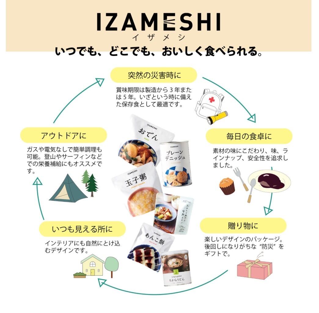 ご飯やおかずはもちろん、パンやスイーツまでフルコースの食事が揃う長期保存食IZAMESHI(イザメシ)。