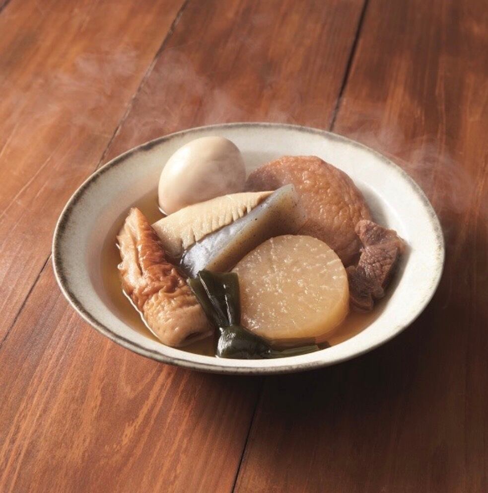 ■原材料:大根水煮(インドネシア製造)、ゆで玉子、大判揚げ、こんにゃく、ちくわ、たけのこ水煮、牛すじ、結び昆布、おでん汁の素(しょうゆ、食塩、ぶどう糖果糖液糖、かつおエキス、煮干、野菜エキス、たん白加水分解物、かつお節、さば節、昆布エキス)、水あめ、かつおエキス/ソルビトール、加工でんぷん、調味料(アミノ酸等)、水酸化Ca、酸化防止剤(V.E)、V.C、(一部に卵・小麦・牛肉・さば・大豆を含む)